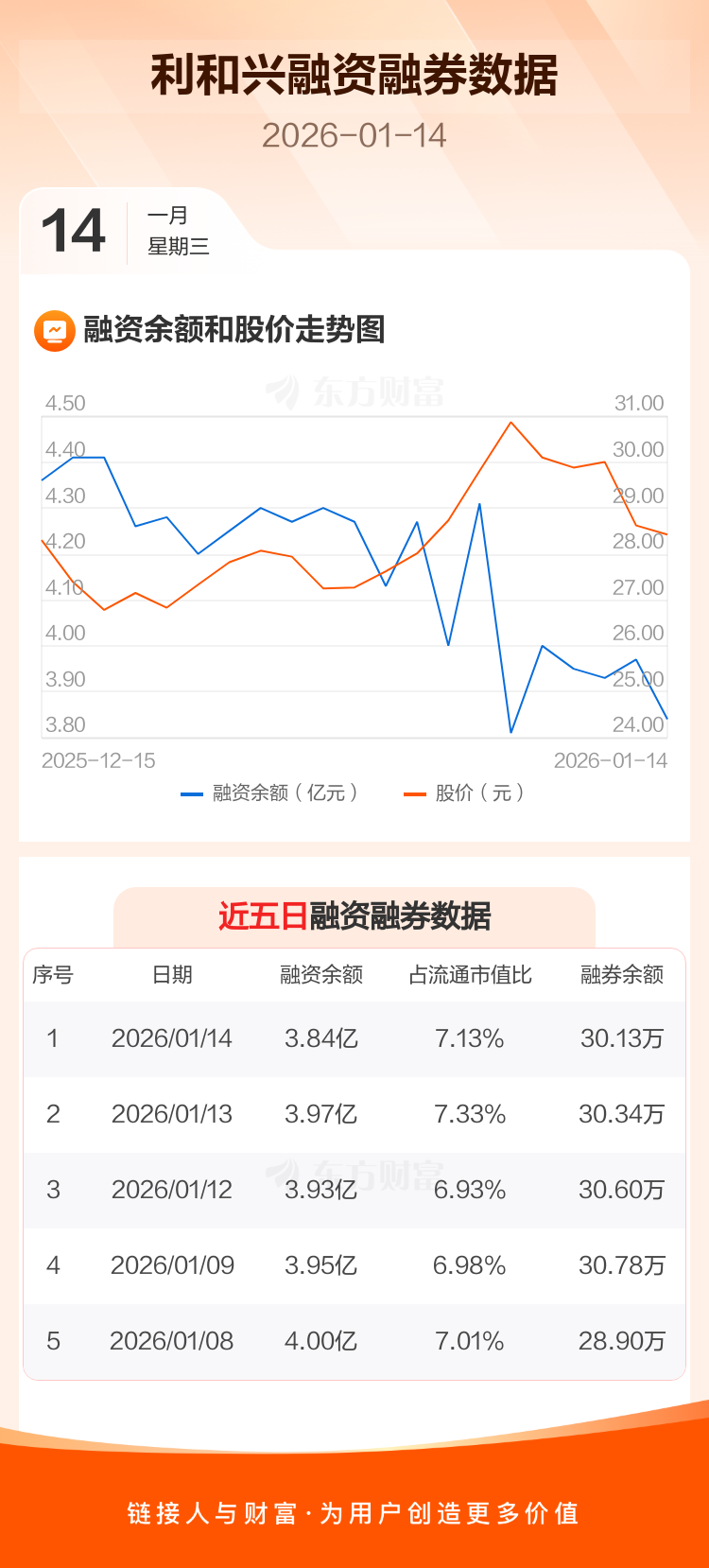 交易所最新数据显示,利和兴于2026年1月14日获融资买入8432.34万元,融资偿还9750.73万元,当日融资净偿还1318.39万元。目前,该股融资余额3.84亿,占流通市值比例为7.13%。