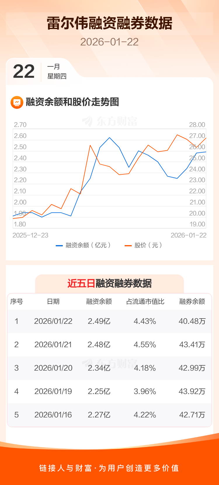 交易所最新数据显示,雷尔伟于2026年1月22日获融资买入3479.81万元,融资偿还3319.34万元,当日融资净买入160.47万元。目前,该股融资余额2.49亿,占流通市值比例为4.43%。