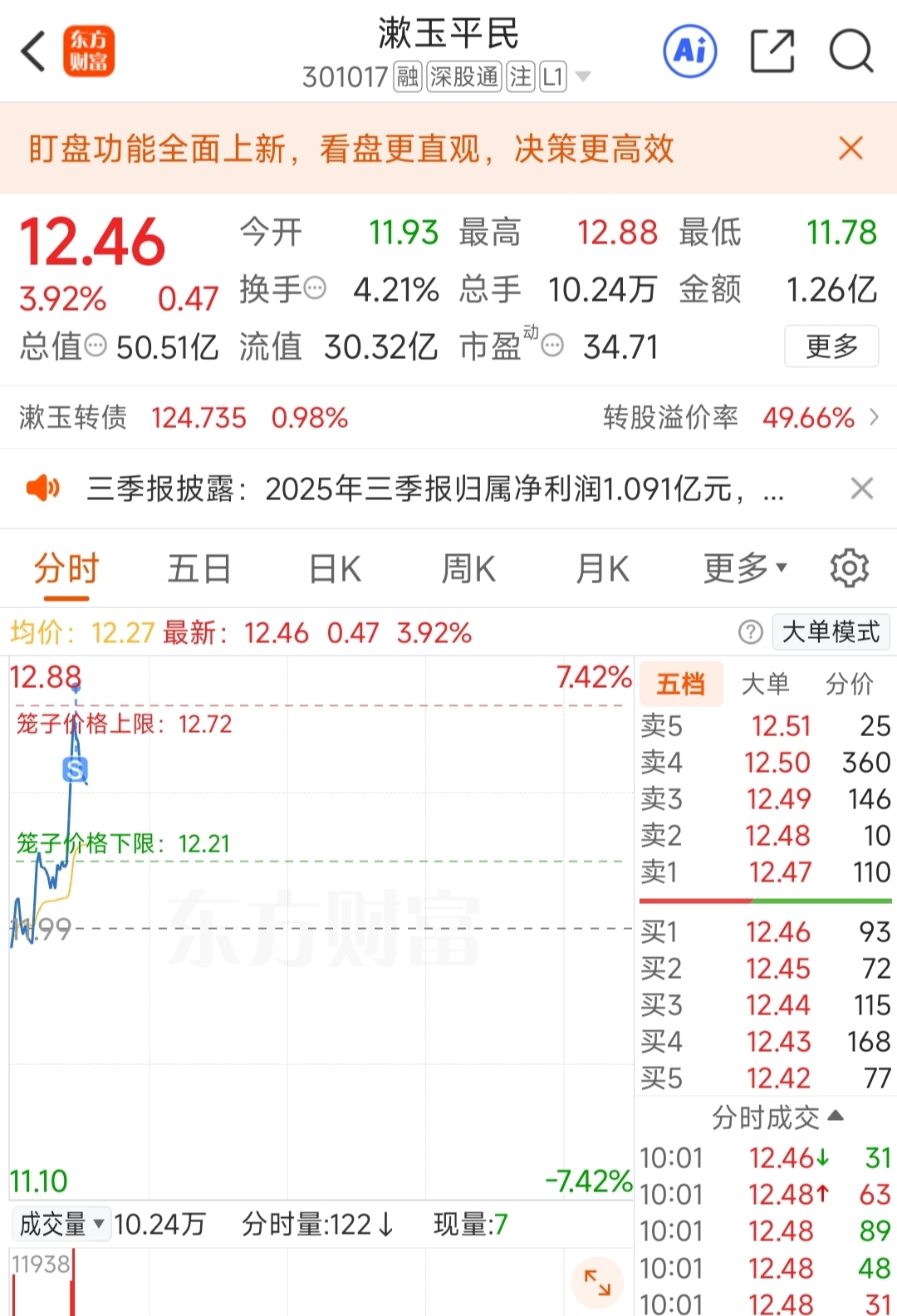 $漱玉平民(SZ301017)$ 12.70跑了,下来接回~