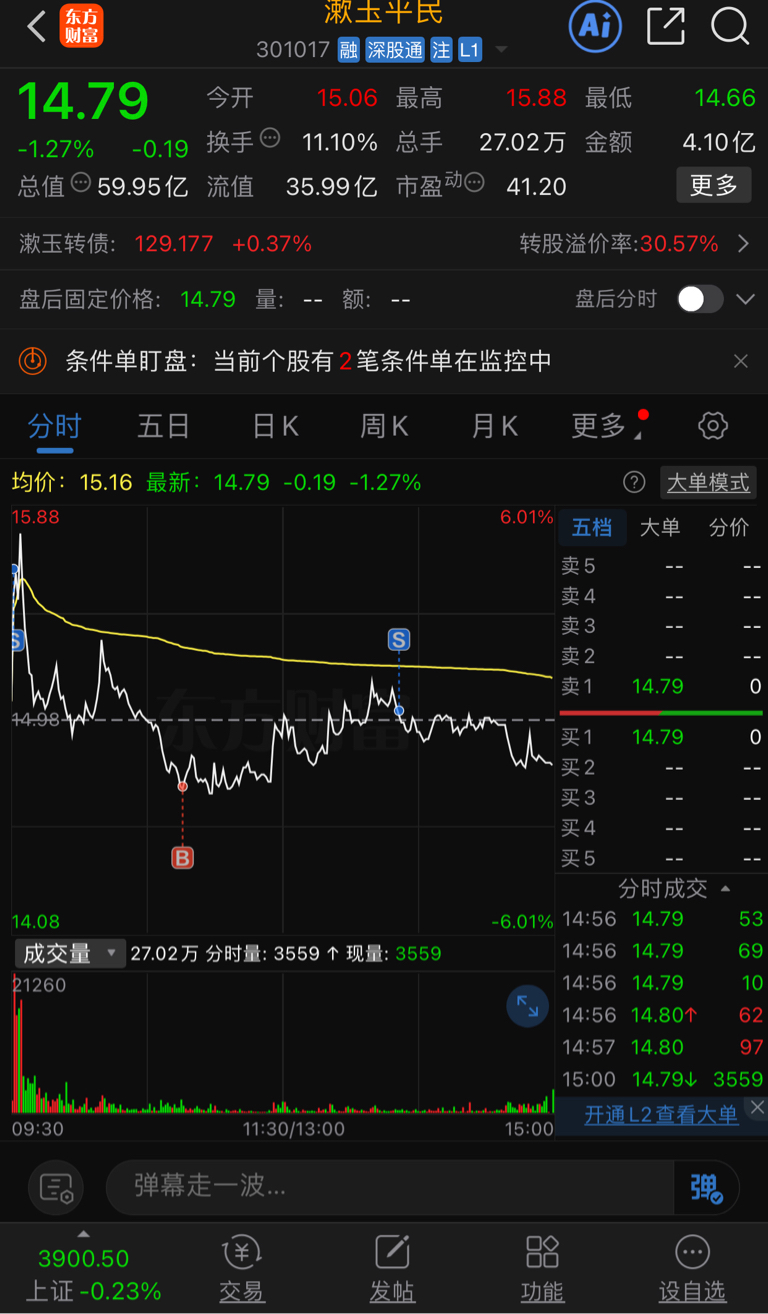 $漱玉平民(SZ301017)$ (SZ301017)$今天太难操作了,有没有和我相同感受的朋友?早盘冲高6个点,尾盘还绿了一个多点,早盘准备分批出的,就出了1/3,低点接了一些,午盘熬不住了把能卖的都卖了,总体而言,今天这只票上面还是赚了一些。