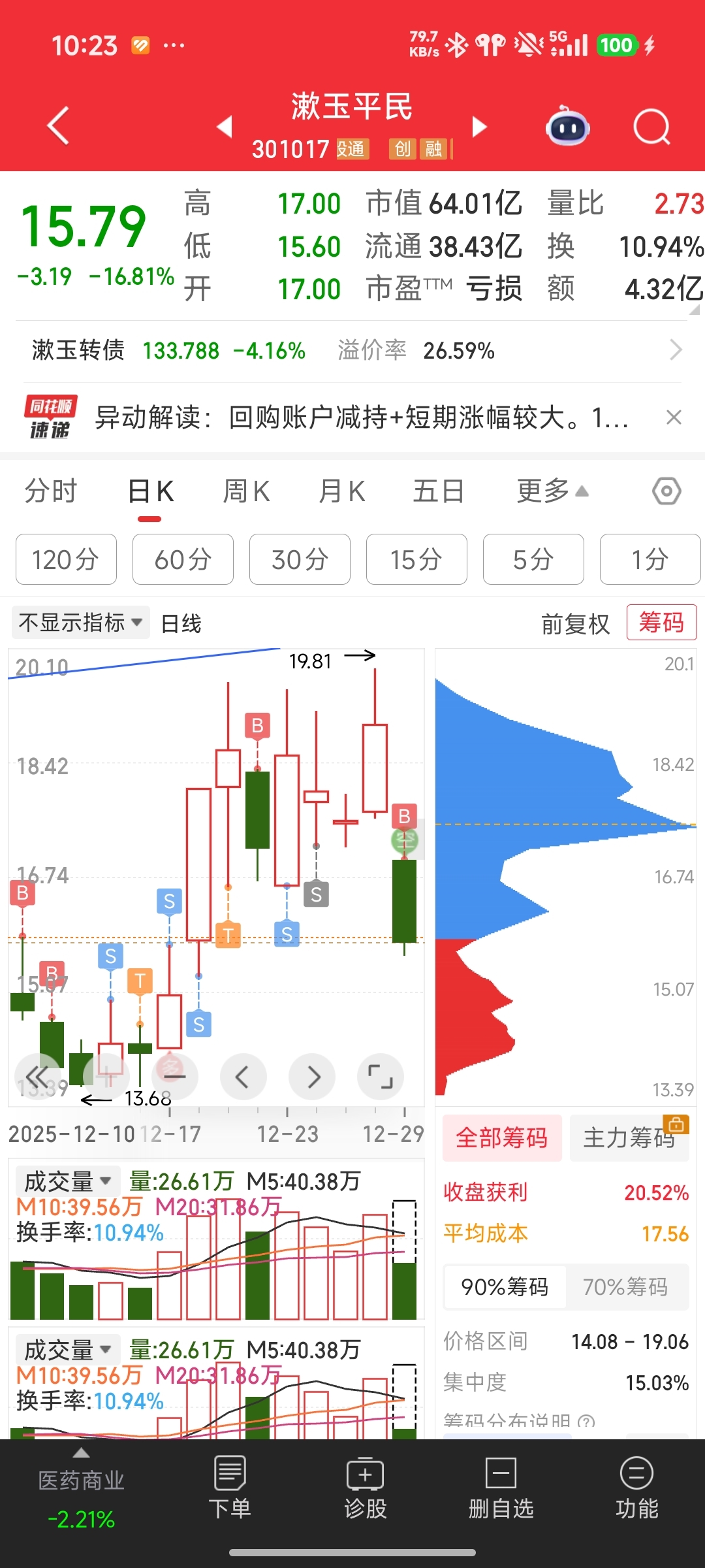 今天翻红出了昨天抄底的全部,留个观察仓, 总觉得吧 还是可能要考验一下14.5附近的支撑的,但其实要强势洗盘的话 这周可以不拉升 明年初之间拉回 更好,也就是不破15元,这里要防止缩量破位吧,如果这股选择先充分调整,那么明年的某一天我还会回来玩你的