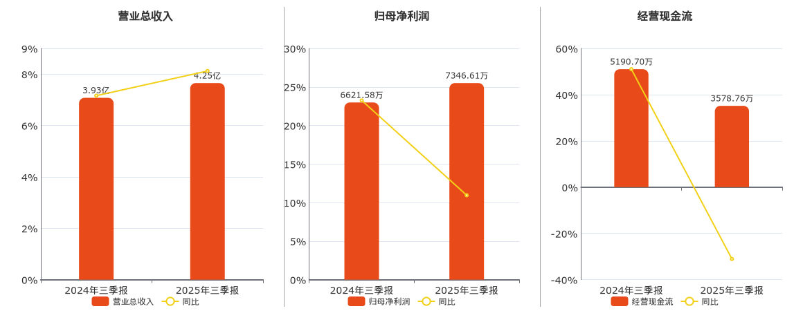 公司营业总收入为4.25亿元,较去年同报告期营业总收入增加3193.09万元,实现3年连续上涨,同比较去年同期上涨8.12%。归母净利润为7346.61万元,较去年同报告期归母净利润增加725.04万元,实现3年连续上涨,同比较去年同期上涨10.95%。经营活动现金净流入为3578.76万元。