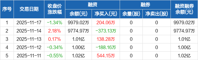 密封科技:融资净买入204.06万元,融资余额9979.02万元(11-17)