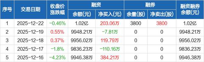 密封科技:融资净买入203.06万元,融资余额1.02亿元(12-22)