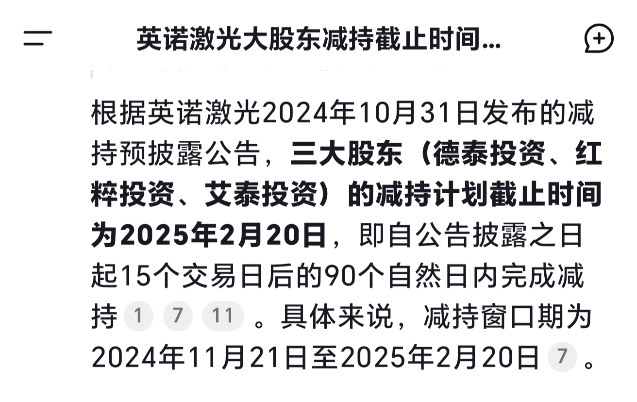 $英诺激光(SZ301021)$ 红粹还差70万股(市价不到2千万)而且必须大宗交易,对股价没啥影响。三家股东已经减持的差不多了,等最后一笔大宗交易完成以后会同时公布减持完毕。对股价影响更多的还是心理层面,20号是最后截止日期。大股东也不会压线减持,静等英诺激光报复性上涨。