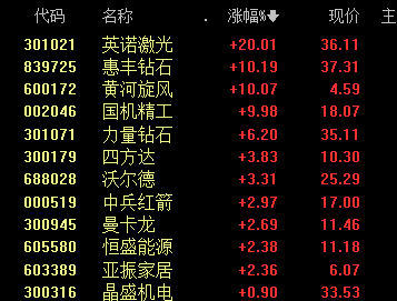 培育钻石概念早盘股价异动,截至午间收盘,英诺激光收获20%幅度涨停,黄河旋风、国机精工同样涨停,惠丰钻石涨超10%,四方达、力量钻石等跟涨。