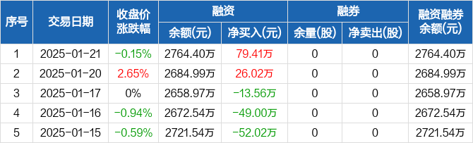 海泰科:融资净买入79.41万元,融资余额2764.4万元(01-21)