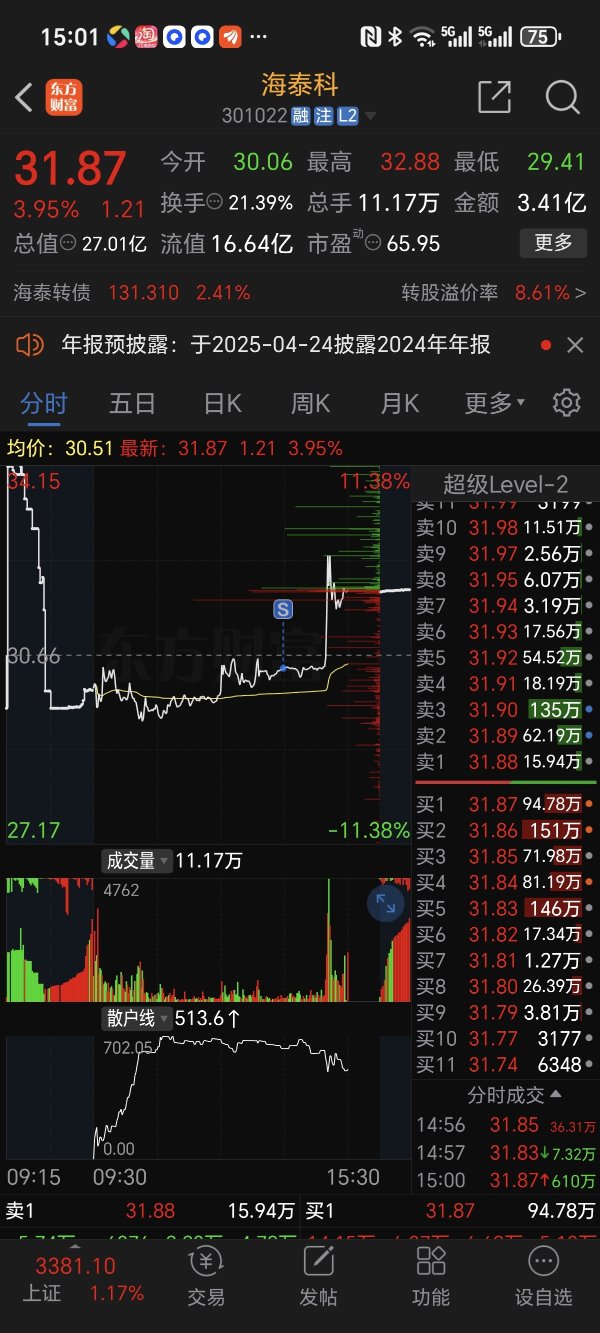 $海泰科(SZ301022)$ 水下卖了,结果最高涨六个点