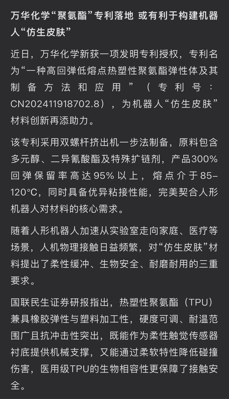 $海泰科(SZ301022)$ 近日,万华化学新获一项发明专利授权,专利名为“一种高回弹低熔点热塑性聚氨酯弹性体及其制备方法和应用”(专利号:CN202411918702.8),为机器人“仿生皮肤”材料创新再添助力。