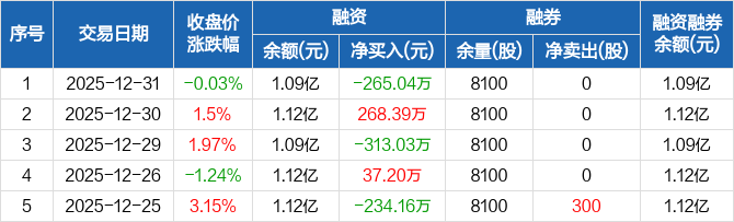 海泰科:融资净偿还265.04万元,融资余额1.09亿元(12-31)