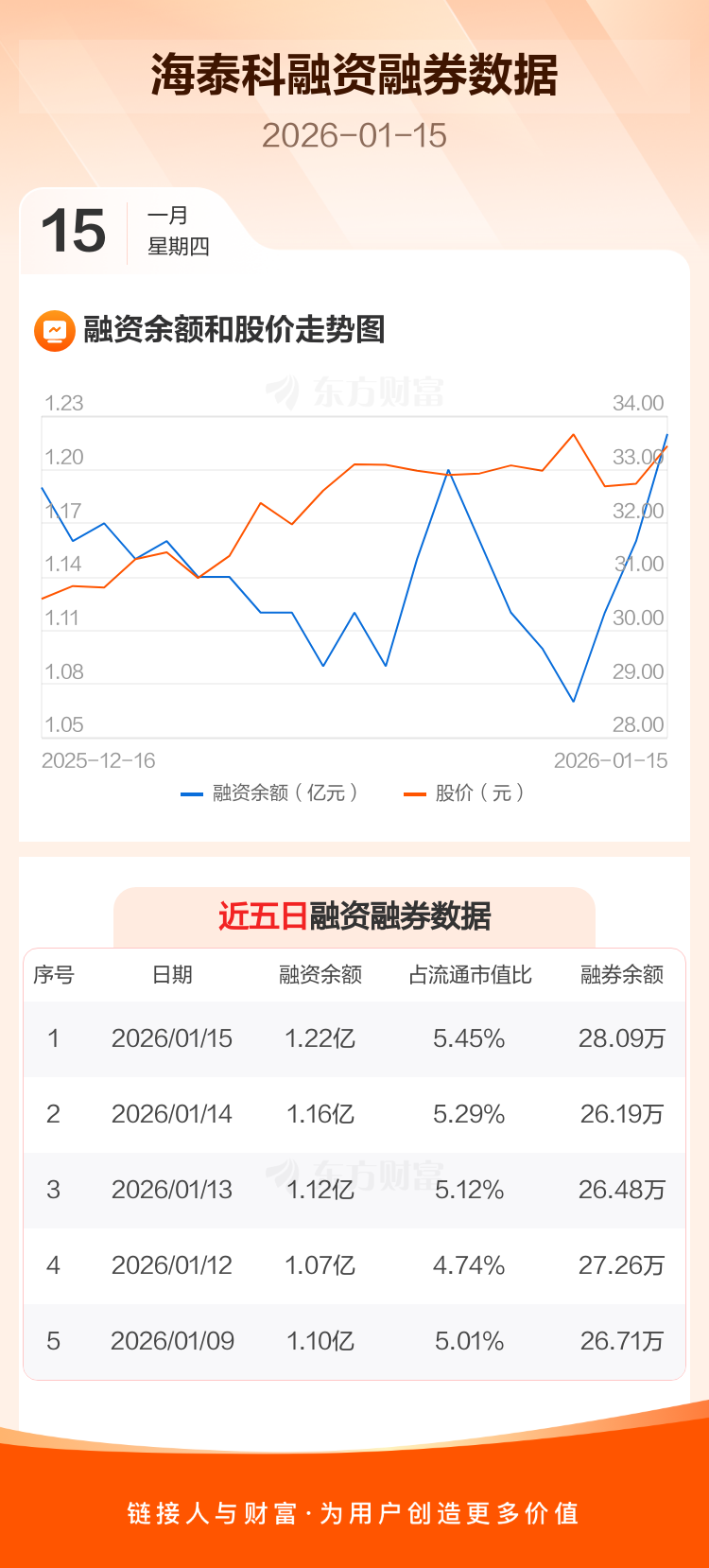 交易所最新数据显示,海泰科于2026年1月15日获融资买入1867.91万元,融资偿还1280.62万元,当日融资净买入587.28万元。目前,该股融资余额1.22亿,占流通市值比例为5.45%。