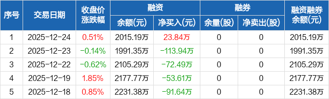 霍普股份:融资净买入23.84万元,融资余额2015.19万元(12-24)