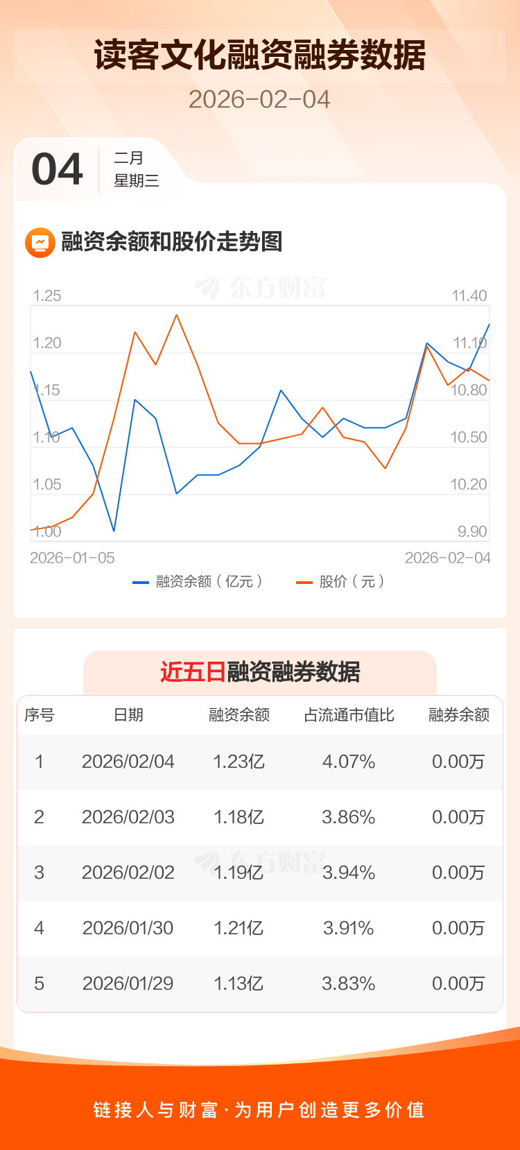 交易所最新数据显示,读客文化于2026年2月4日获融资买入1642.86万元,融资偿还1091.35万元,当日融资净买入551.51万元。目前,该股融资余额1.23亿,占流通市值比例为4.07%。