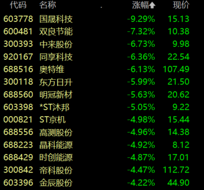光伏设备板块走低,国晟科技跌超9%,双良节能跌超7%,同享科技、中来股份跌超6%。