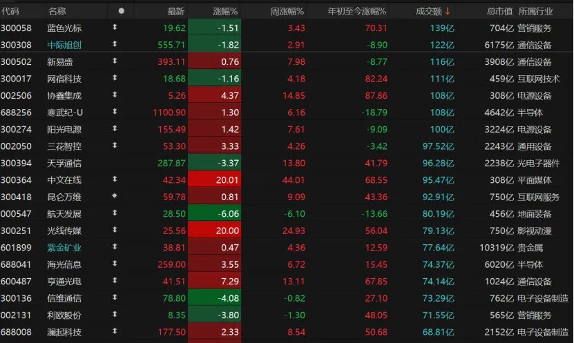 个股涨跌互现,3128只个股收跌,跌停股10只;2195只个股收涨,涨停股71只。今日成交额不低于100亿元的仅剩7只,蓝色光标、中际旭创、网宿科技均微跌,协鑫集成涨幅超过4%。中文在线“20cm”涨停,收报42.34元/股;光线传媒“20cm”涨停,收报25.56元/股。