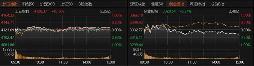 指数涨跌不一,沪指收涨0.13%报4128.37点,创业板指收跌0.37%报3320.54点,深证成指微红。科创50、沪深300、上证50均微红,北证50微跌。