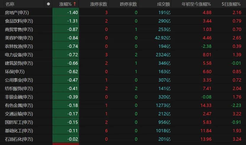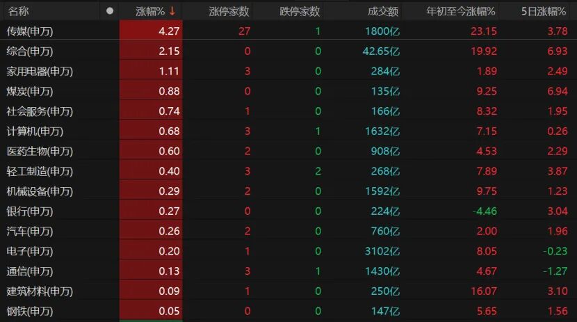 31个申万一级行业中,有15个飘红。传媒板块大涨,综合、家用电器、煤炭、社会服务、计算机、医药生物均微红。