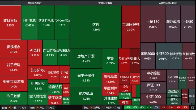 盘面上,影视概念、AI语料、短剧互动游戏、数字阅读、平面媒体等大涨。HIT电池、航空机场、光电子器件、饮料均收跌。