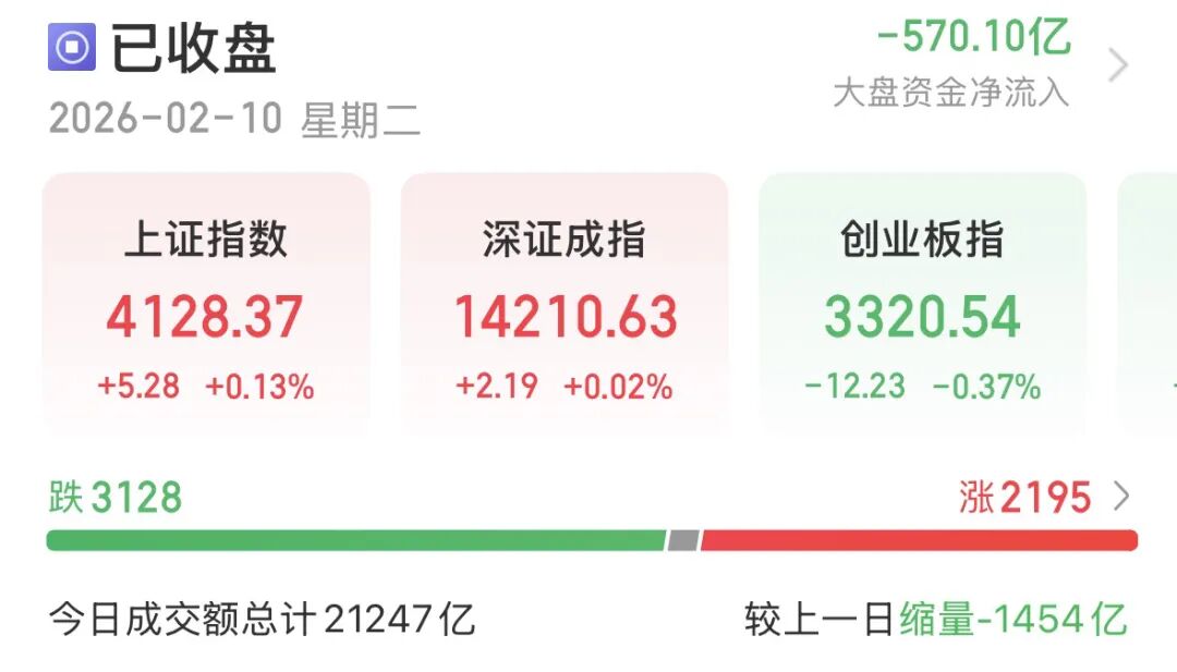 2月10日,A股缩量震荡、个股分化,27只传媒股涨停,成交额缩至2.12万亿元。