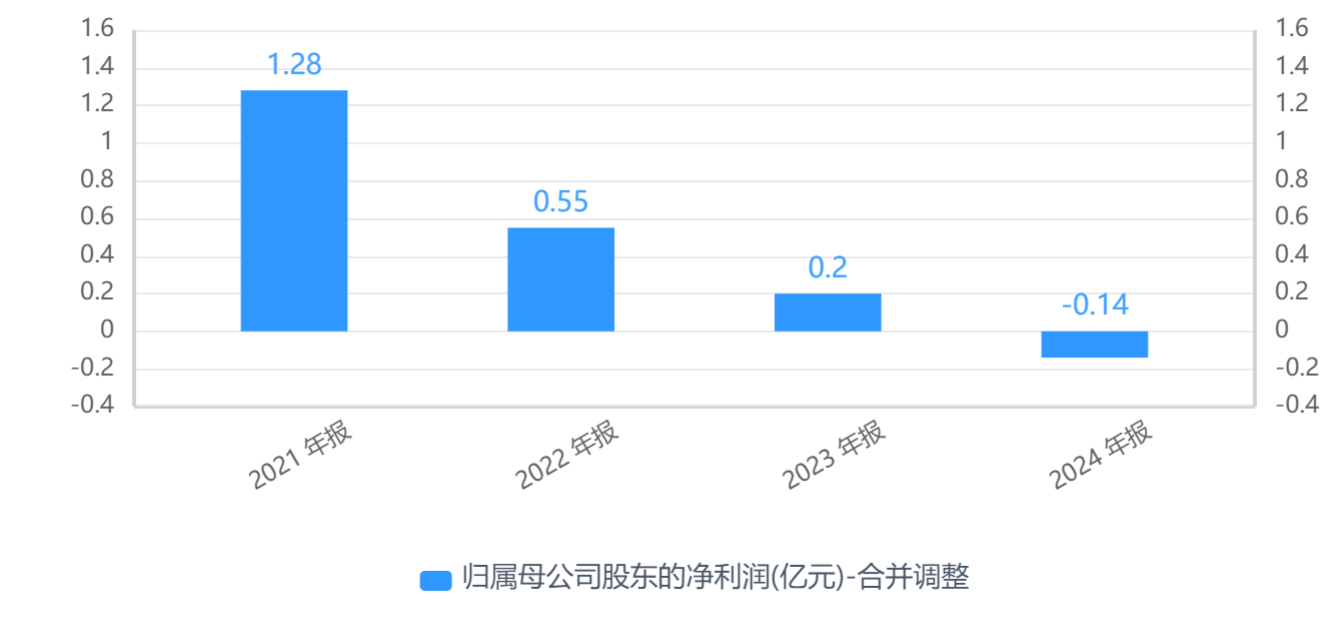 上市后,华蓝集团净利逐年走低,并在去年陷入亏损。2021年至2024年,公司归母净利润分别为1.28亿元、0.55亿元、0.2亿元、-0.14亿元。