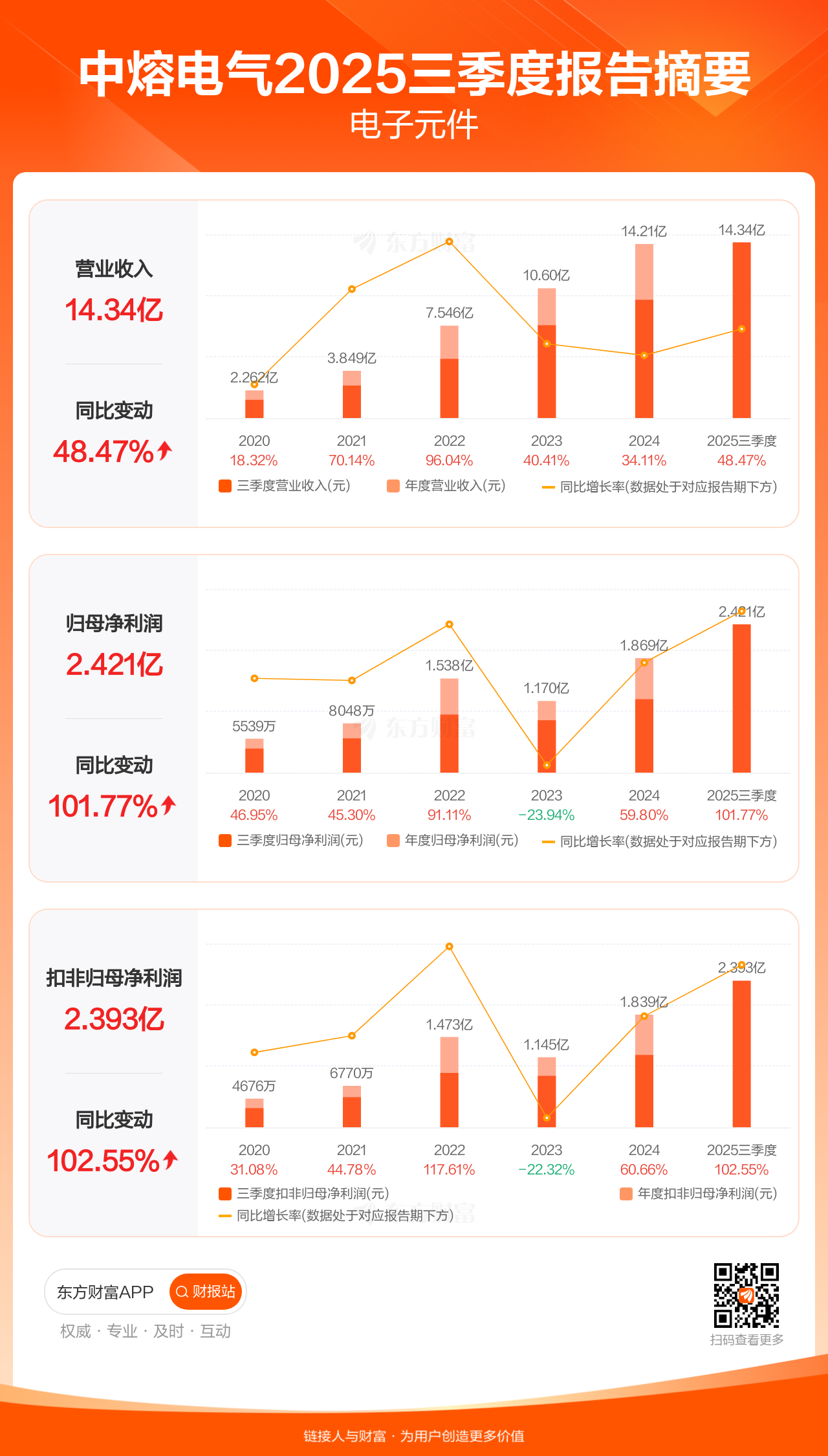 中熔电气10月28日发布2025年三季报显示,公司前三季实现营业收入14.34亿元,同比增长48.47%;归母净利润2.42亿元,同比增长101.77%;扣非归母净利润2.39亿元,同比增长102.55%。