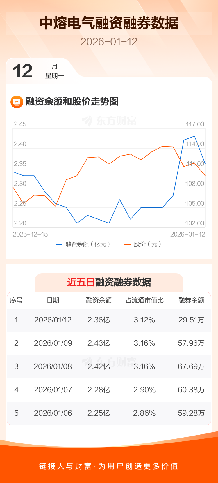 交易所最新数据显示,中熔电气于2026年1月12日获融资买入3024.11万元,融资偿还3785.15万元,当日融资净偿还761.04万元。目前,该股融资余额2.36亿,占流通市值比例为3.12%。