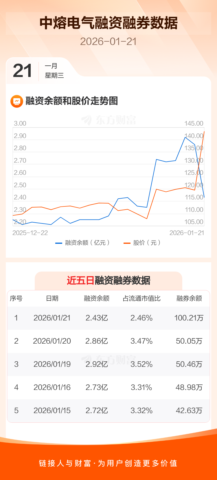 交易所最新数据显示,中熔电气于2026年1月21日获融资买入5298.25万元,融资偿还9549.11万元,当日融资净偿还4250.86万元。目前,该股融资余额2.43亿,占流通市值比例为2.46%。