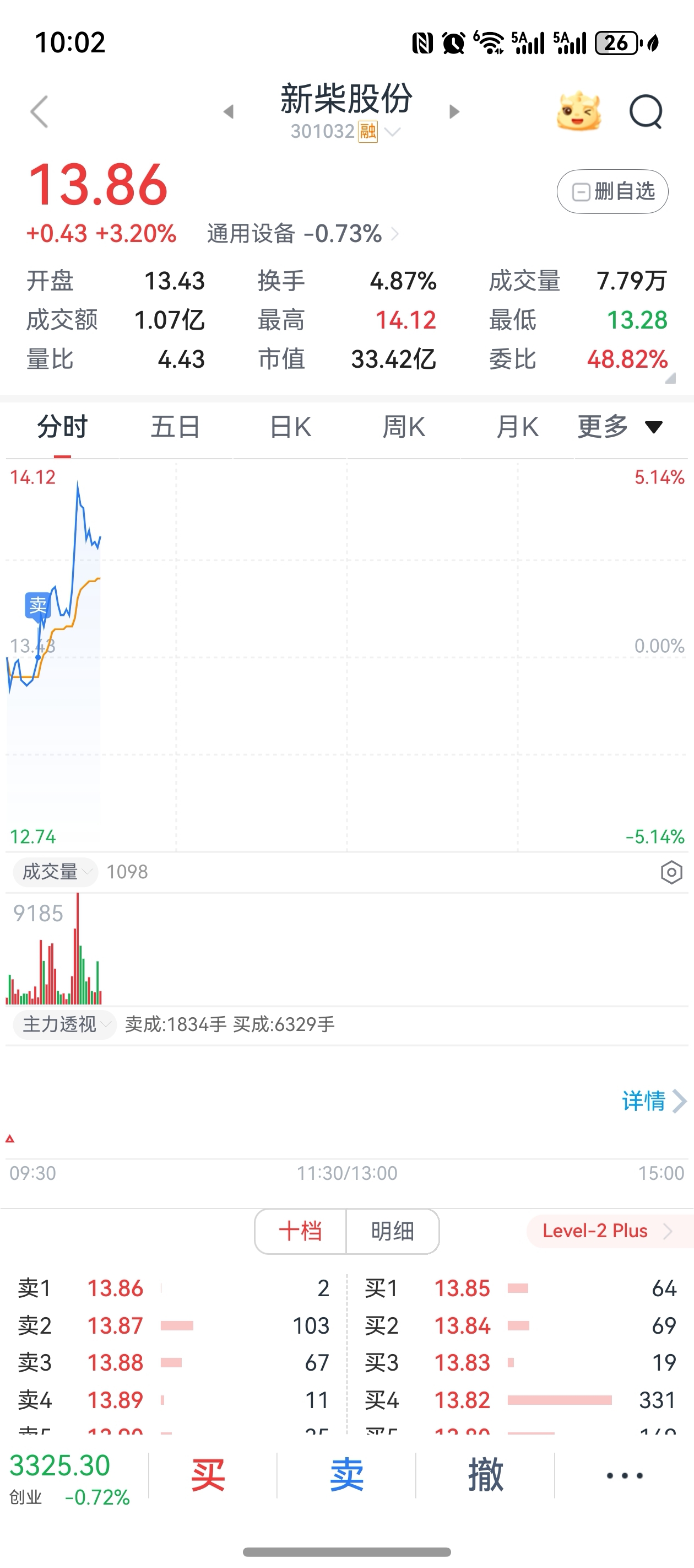 $新柴股份(SZ301032)$ 明显游资票,今天跑早了,日