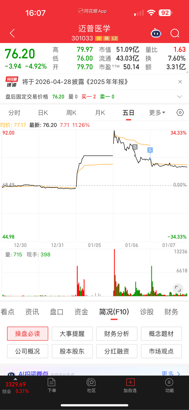 $迈普医学(SZ301033)$ 说卖就卖,套了我400大洋