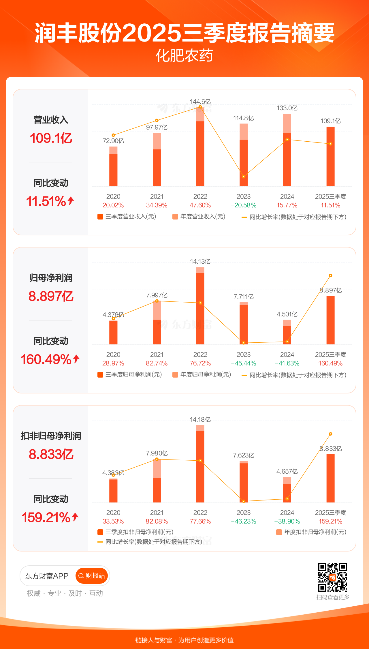 润丰股份10月24日发布2025年三季报显示,公司前三季实现营业收入109.11亿元,同比增长11.51%;归母净利润8.90亿元,同比增长160.49%;扣非归母净利润8.83亿元,同比增长159.21%。