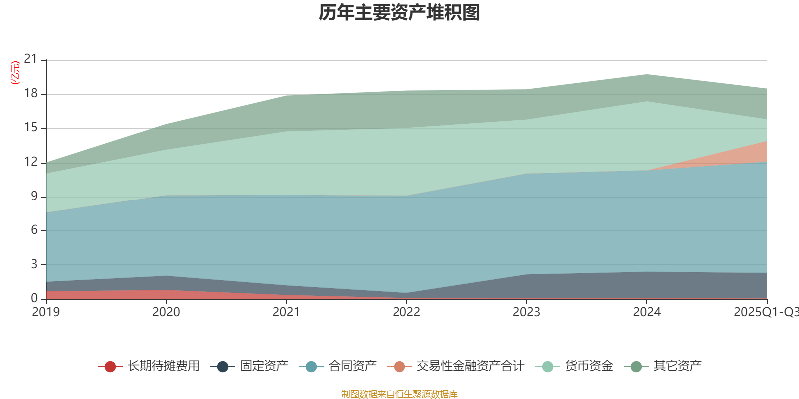 资产重大变化方面,截至2025年三季度末,公司货币资金较上年末减少68.65%,占公司总资产比重下降20.39个百分点;交易性金融资产合计占公司总资产的9.81%,上年末为0;合同资产较上年末增加9.69%,占公司总资产比重上升7.75个百分点;其他非流动资产较上年末增加3377.53%,占公司总资产比重上升1.73个百分点。