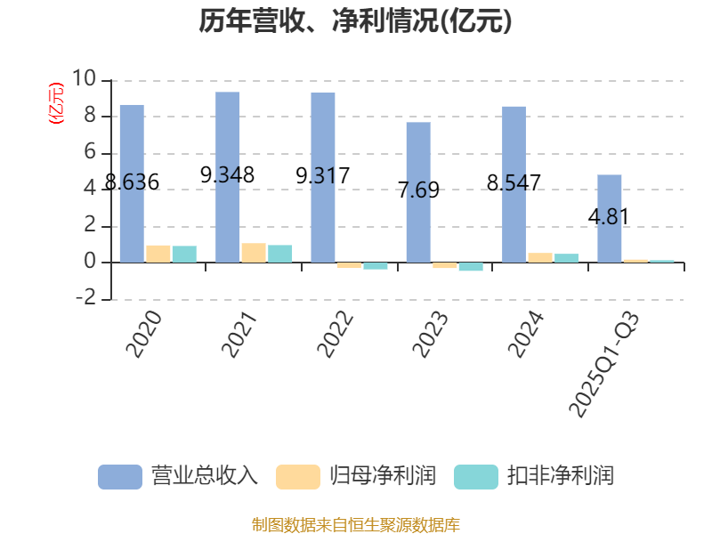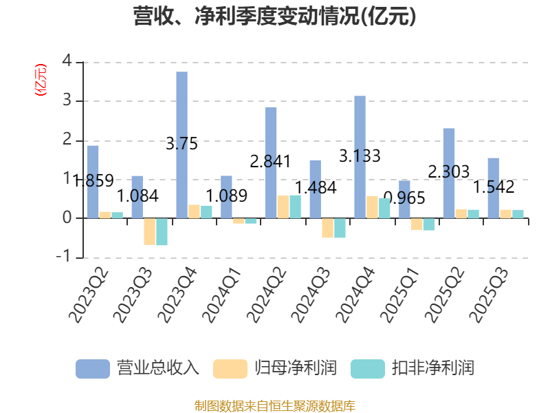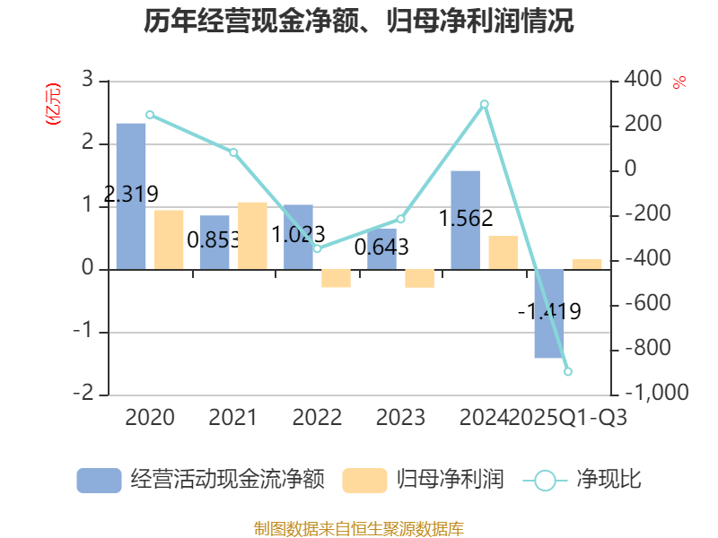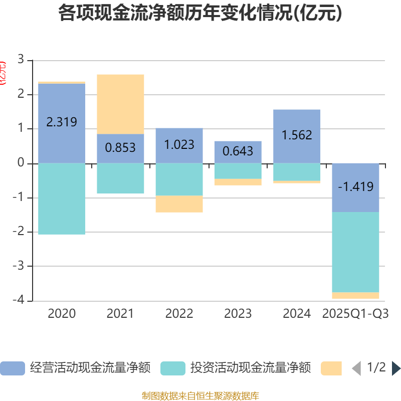 2025年前三季度,公司经营活动现金流净额为-1.42亿元,同比减少1.13亿元;筹资活动现金流净额-1816.43万元,同比减少946.18万元;投资活动现金流净额-2.34亿元,上年同期为-2.95亿元。