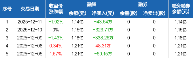 融资方面,当日融资买入312.86万元,融资偿还356.5万元,融资净偿还43.64万元,连续3日净偿还累计705.61万元。融券方面,融券卖出0股,融券偿还0股,融券余量0股,融券余额0元。融资融券余额合计1.14亿元。