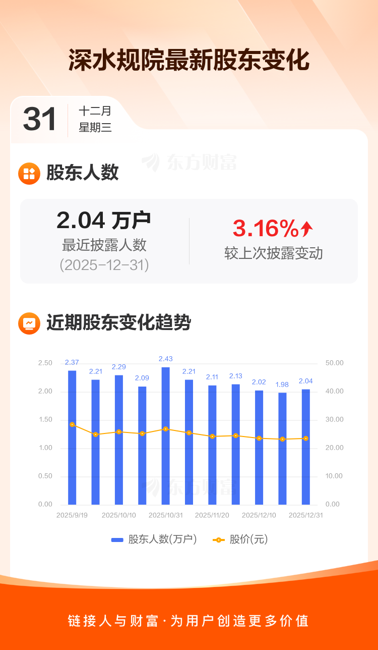 深水规院:截至12月31日最新股东户数2.04万户,较上期增加3.16%