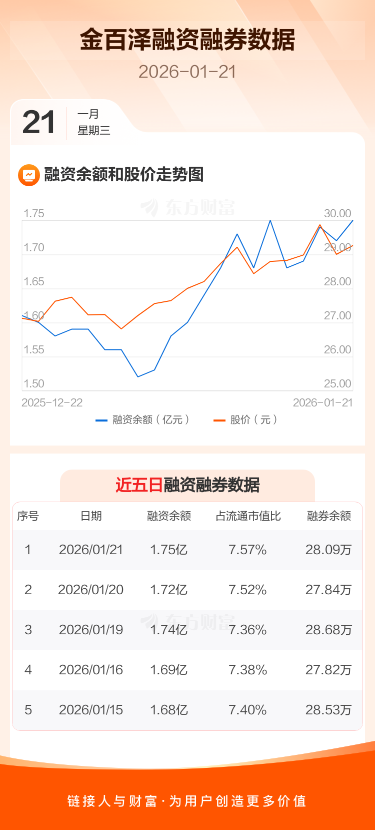 交易所最新数据显示,金百泽于2026年1月21日获融资买入1052.53万元,融资偿还790.33万元,当日融资净买入262.2万元。目前,该股融资余额1.75亿,占流通市值比例为7.57%。