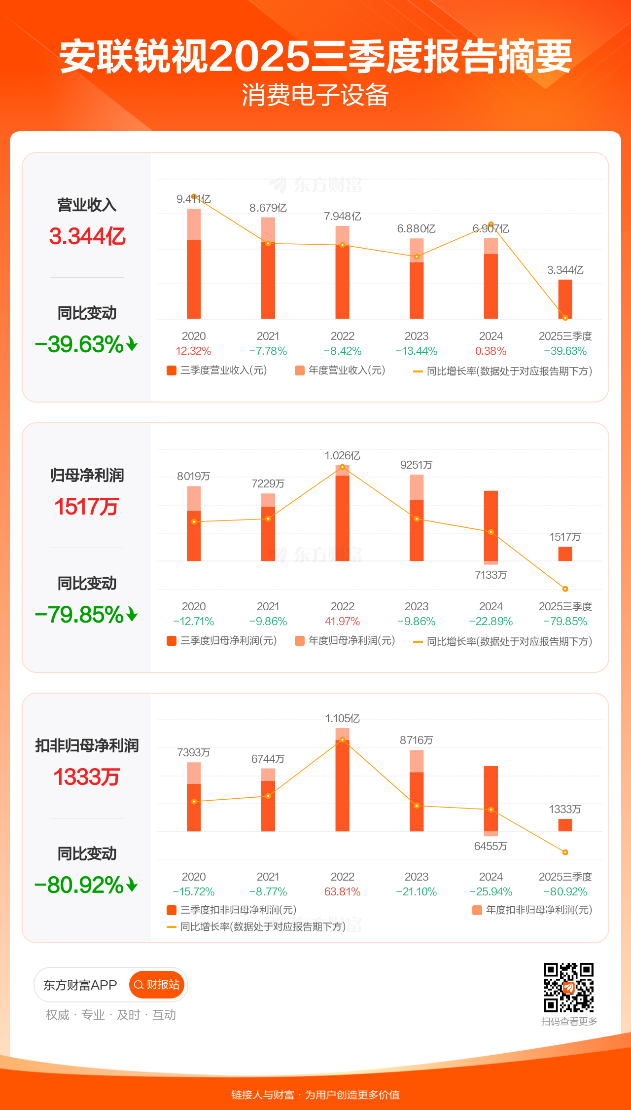 安联锐视10月29日发布2025年三季报显示,公司前三季实现营业收入3.34亿元,同比下滑39.63%;归母净利润1516.66万元,同比下滑79.85%;扣非归母净利润1332.87万元,同比下滑80.92%。