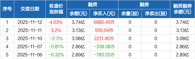 融资方面,当日融资买入8241.18万元,融资偿还2158.7万元,融资净买入6082.49万元,净买入额创历史新高,连续3日净买入累计8843.98万元。融券方面,融券卖出0股,融券偿还0股,融券余量0股,融券余额0元。融资融券余额合计3.74亿元。
