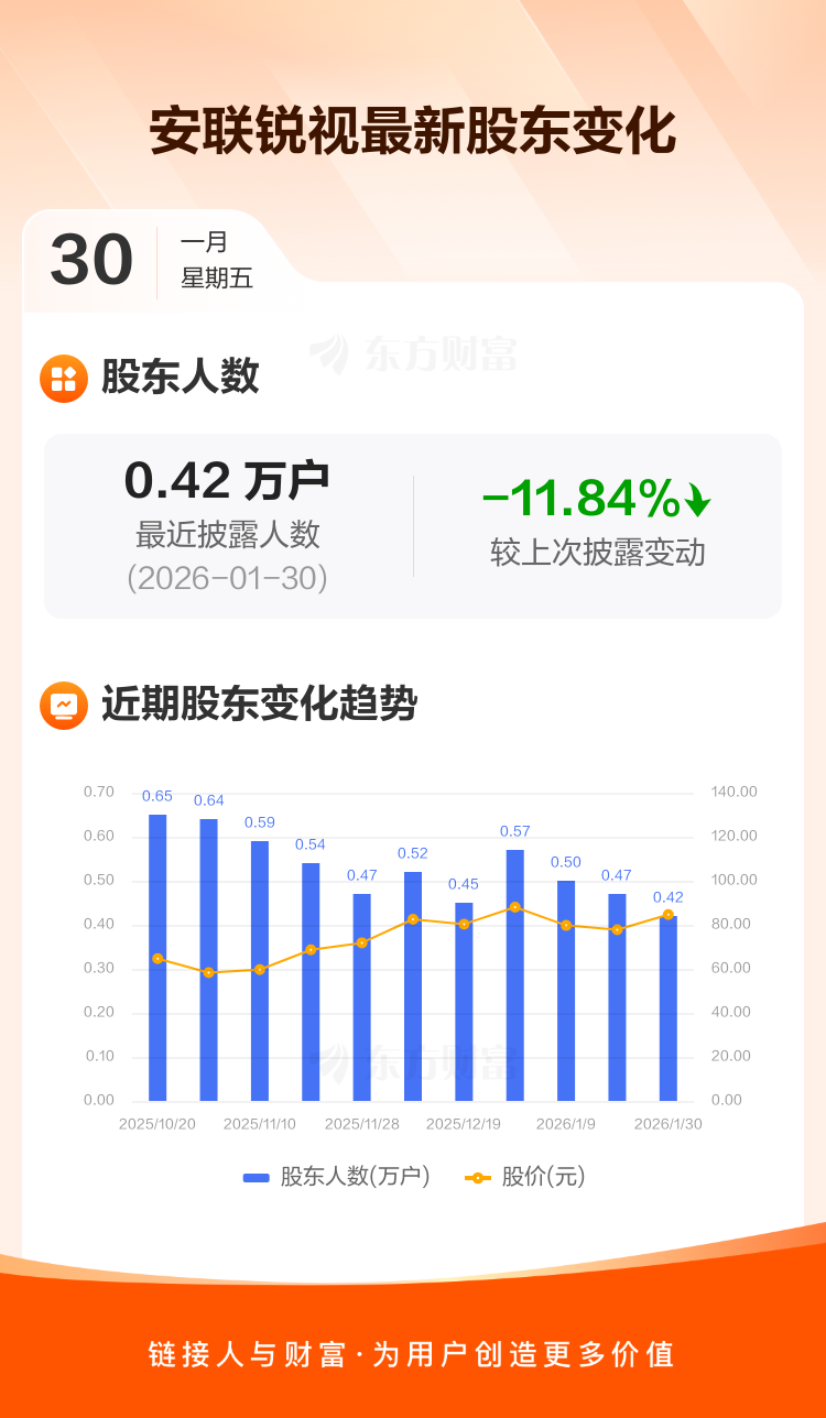 安联锐视最新披露数据显示,截至1月30日公司股东户数为4153户,较上期(2026年1月20日)减少558户,降幅为11.84%。户均持有流通股数量由上期的1.40万股上升至1.59万股,户均持股金额由上期的108.96万元增加至134.54万元。