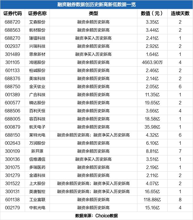 12月25日沪深两市共有129只股票两融数据创历史新高/新低,部分数据如下: