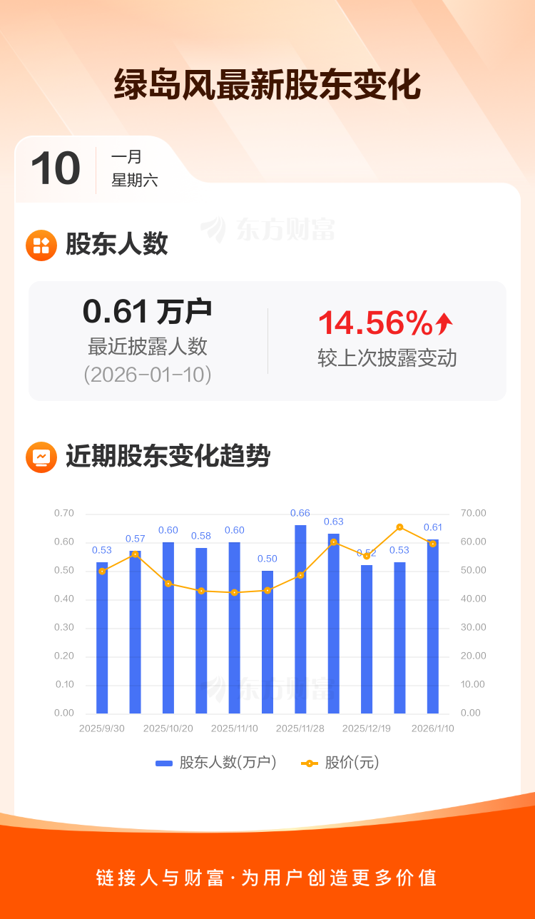 绿岛风最新披露数据显示,截至1月10日公司股东户数为6052户,较上期(2025年12月31日)增加769户,增幅为14.56%。户均持有流通股数量由上期的1.07万股下降至9376股,户均持股金额由上期的70.14万元减少至55.74万元。