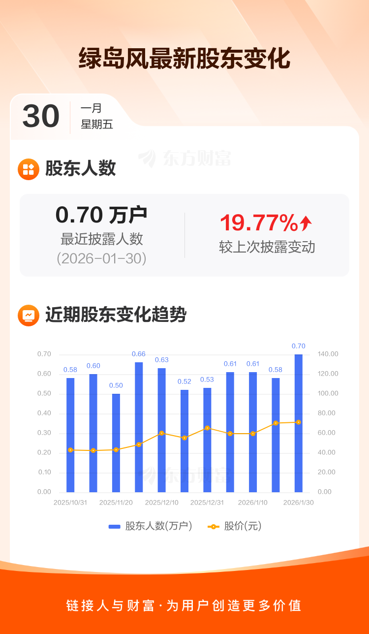 绿岛风最新披露数据显示,截至1月30日公司股东户数为6972户,较上期(2026年1月20日)增加1151户,增幅为19.77%。户均持有流通股数量由上期的9748股下降至8139股,户均持股金额由上期的68.44万元减少至57.90万元。