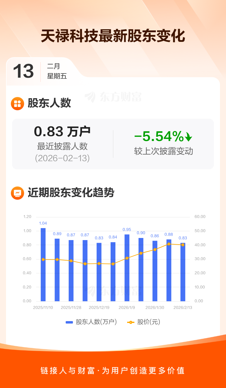 天禄科技最新披露数据显示,截至2月13日公司股东户数为8322户,较上期(2026年2月10日)减少488户,降幅为5.54%。户均持有流通股数量由上期的7259股上升至7685股,户均持股金额由上期的29.56万元增加至30.82万元。