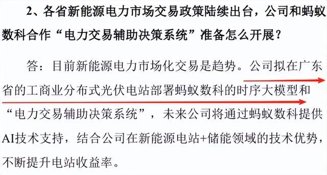 目前新能源电力市场化交易是趋势。能辉科技拟在广东省的工商业分布式光伏电站部署蚂蚁数科的时序大模型和“电力交易辅助决策系统”,未来公司将通过蚂蚁数科提供AI技术支持,结合公司在新能源电站+储能领域的技术优势,不断提升电站收益率。