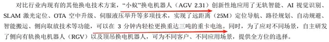 对比行业内现有的其他换电技术方案,“小蚁”换电机器人创新性地应用了无轨智能、AI视觉识别、SLAM激光定位、OTA空中升级、伺服液压举升等多项技术,实现了远距离(25M)定位导航、路径规划、自动规避、智能搬运、侧向取放技术等功能,可以在3分钟内轻松更换重达3吨的重卡电池。