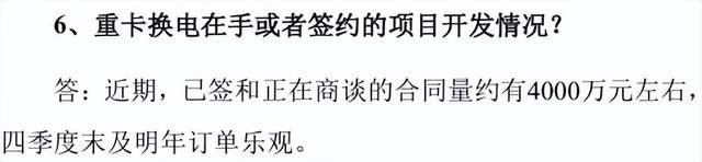 从市场反馈来看,截至目前,电动重卡换电技术服务已贡献了部分营收,近期已签和正在商谈的合同量约有4000万元左右。据能辉科技表示,四季度末及明年订单乐观。