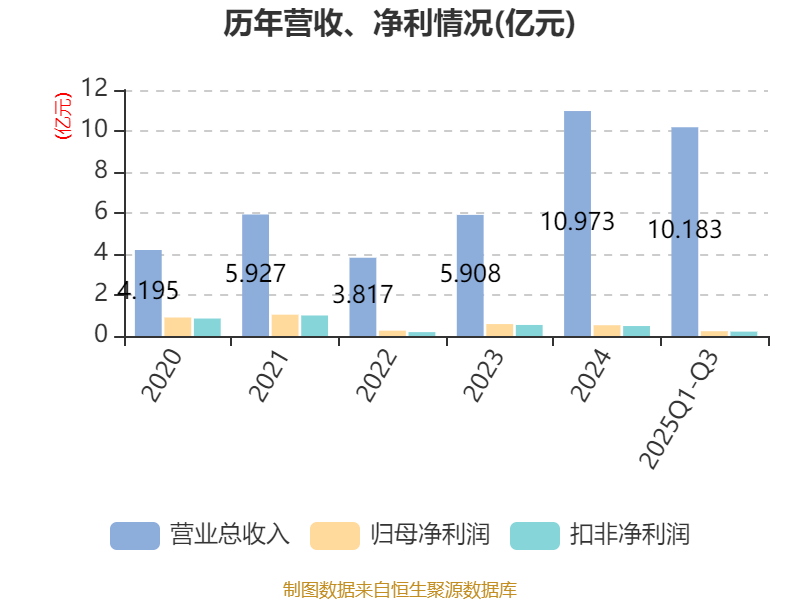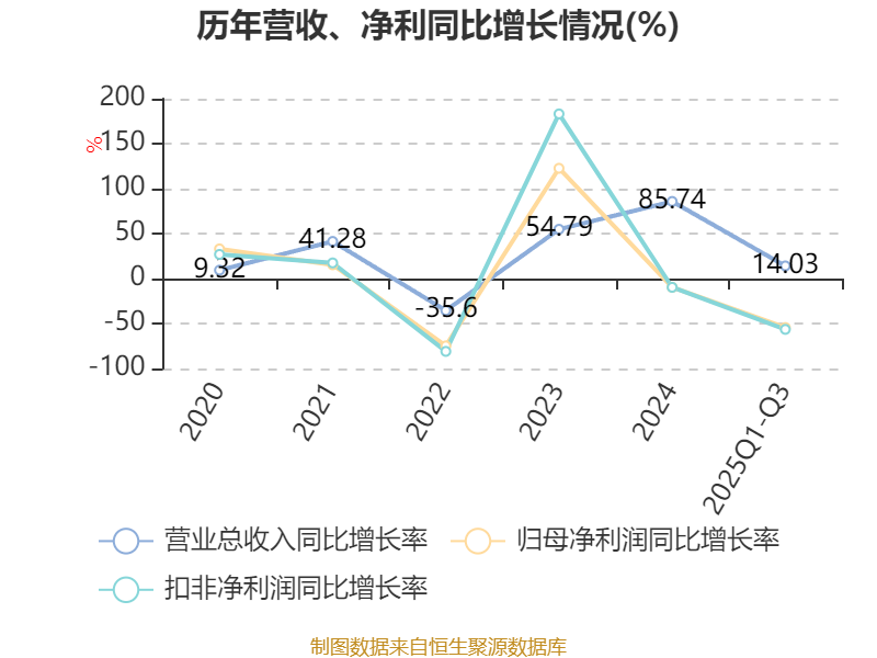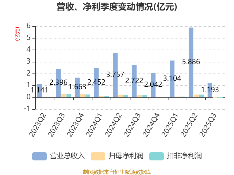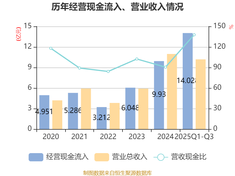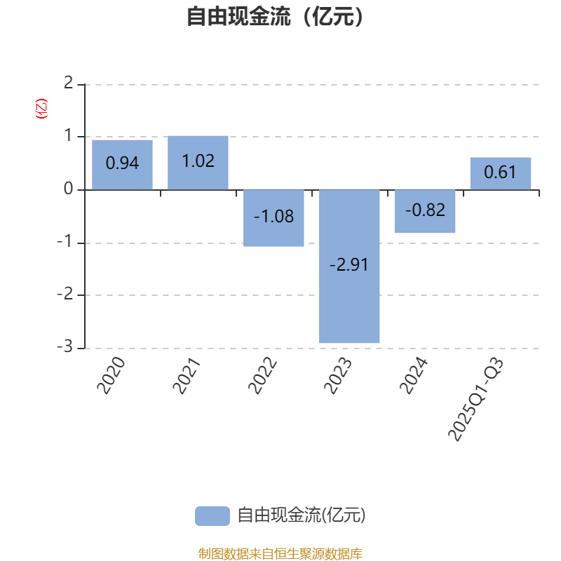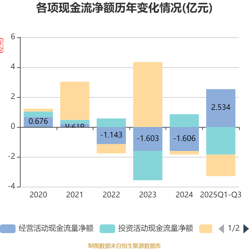 2025年前三季度,公司经营活动现金流净额为2.53亿元,同比增加4.24亿元;筹资活动现金流净额-1.45亿元,同比减少1.43亿元;投资活动现金流净额-1.84亿元,上年同期为6222.14万元。