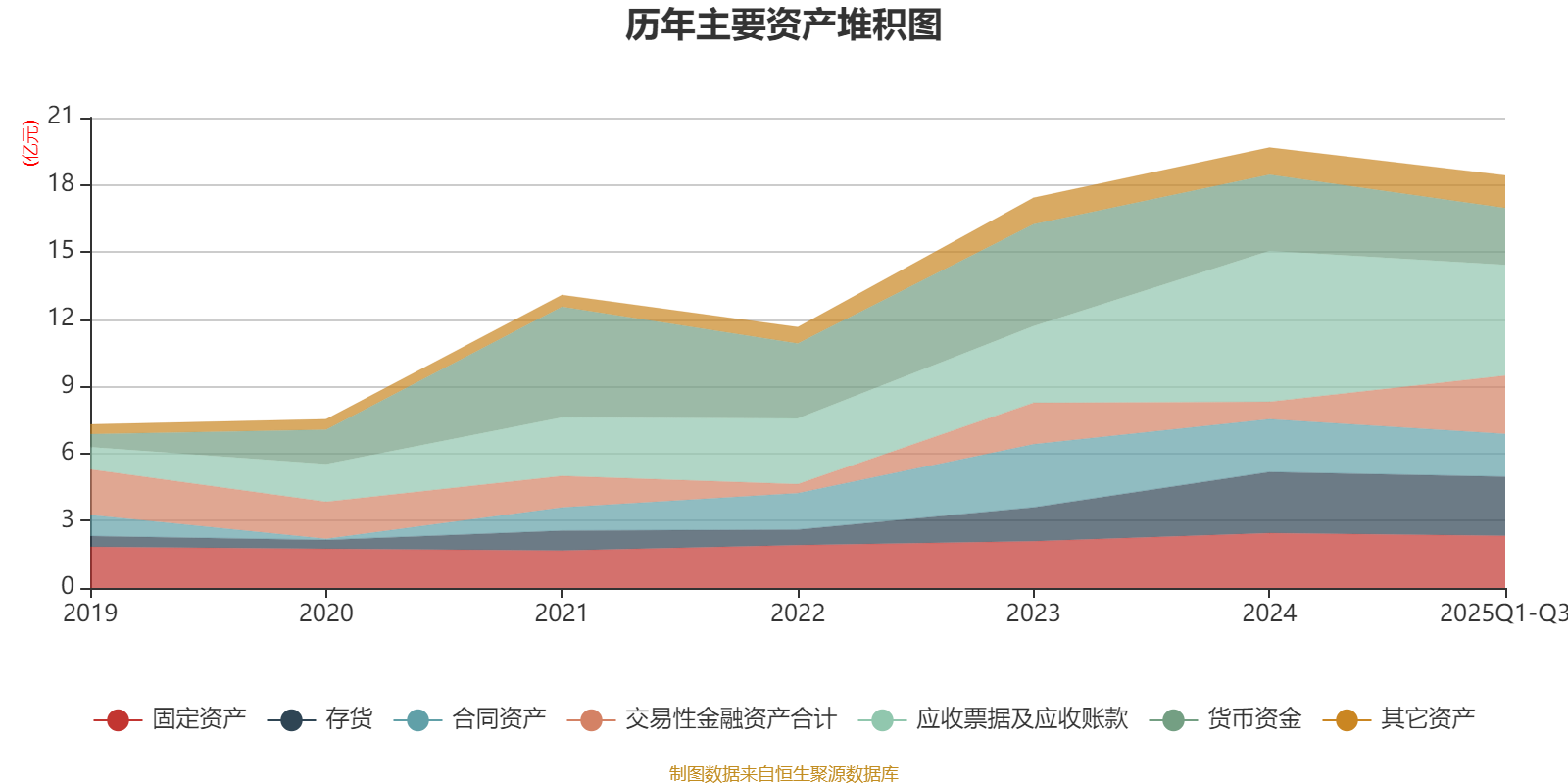 资产重大变化方面,截至2025年三季度末,公司交易性金融资产合计较上年末增加232.93%,占公司总资产比重上升10.15个百分点;应收票据及应收账款较上年末减少26.63%,占公司总资产比重下降7.43个百分点;货币资金较上年末减少25.16%,占公司总资产比重下降3.48个百分点;合同资产较上年末减少18.88%,占公司总资产比重下降1.61个百分点。