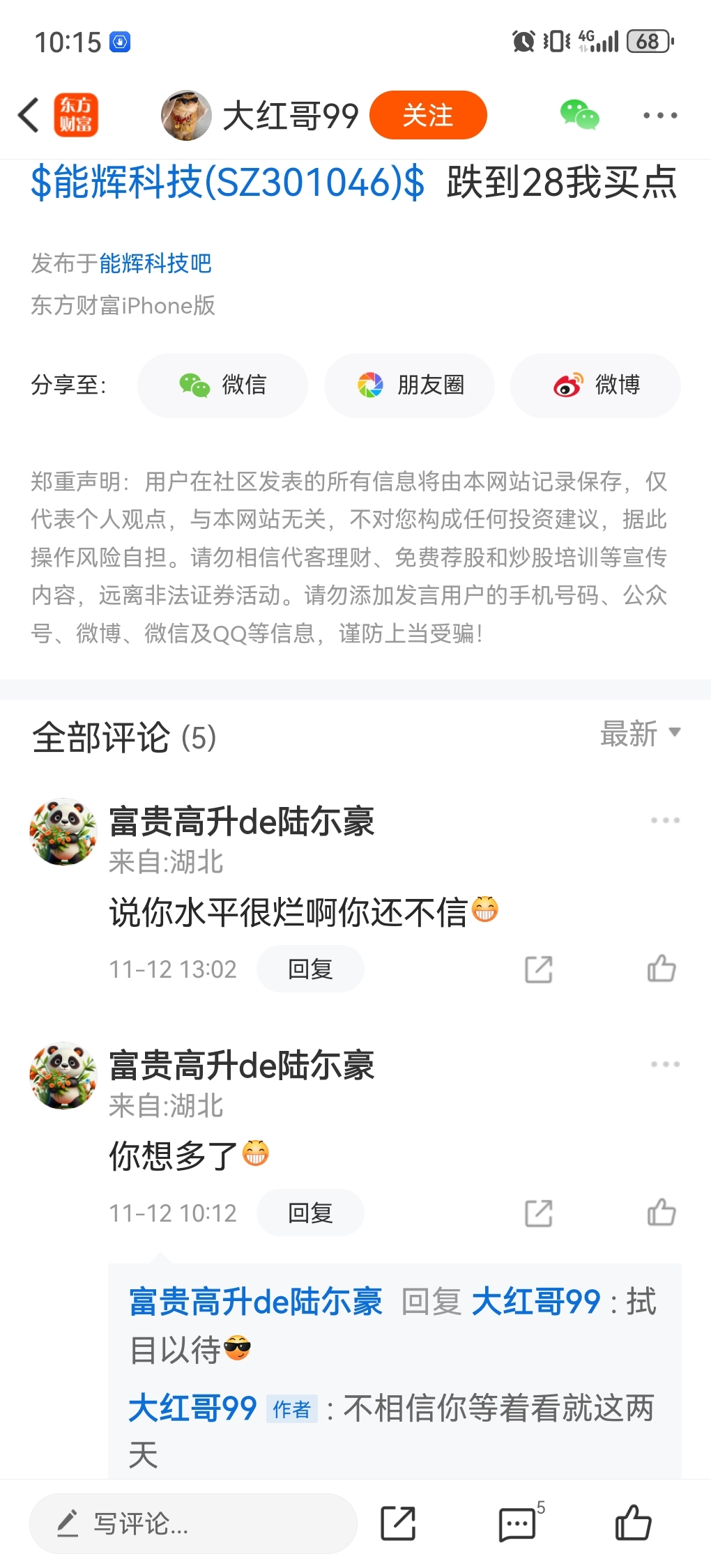 温馨提示: 1.根据《证券法》规定,禁止编造、传播虚假信息或者误导性信息,扰乱证券市场;2.用户在本社区发表的所有资料、言论等仅代表个人观点,与本网站立场无关,不对您构成任何投资建议。用户应基于自己的独立判断,自行决定证券投资并承担相应风险。《东方财富社区管理规定》
