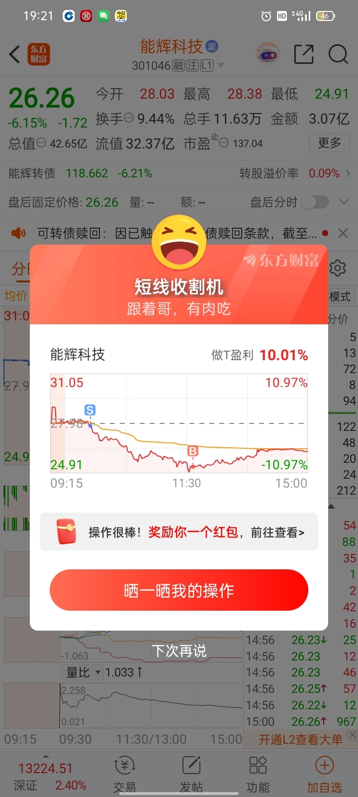 $能辉科技(SZ301046)$ 做个t,,今天不亏就算盈利是吧???打开笑死我了
