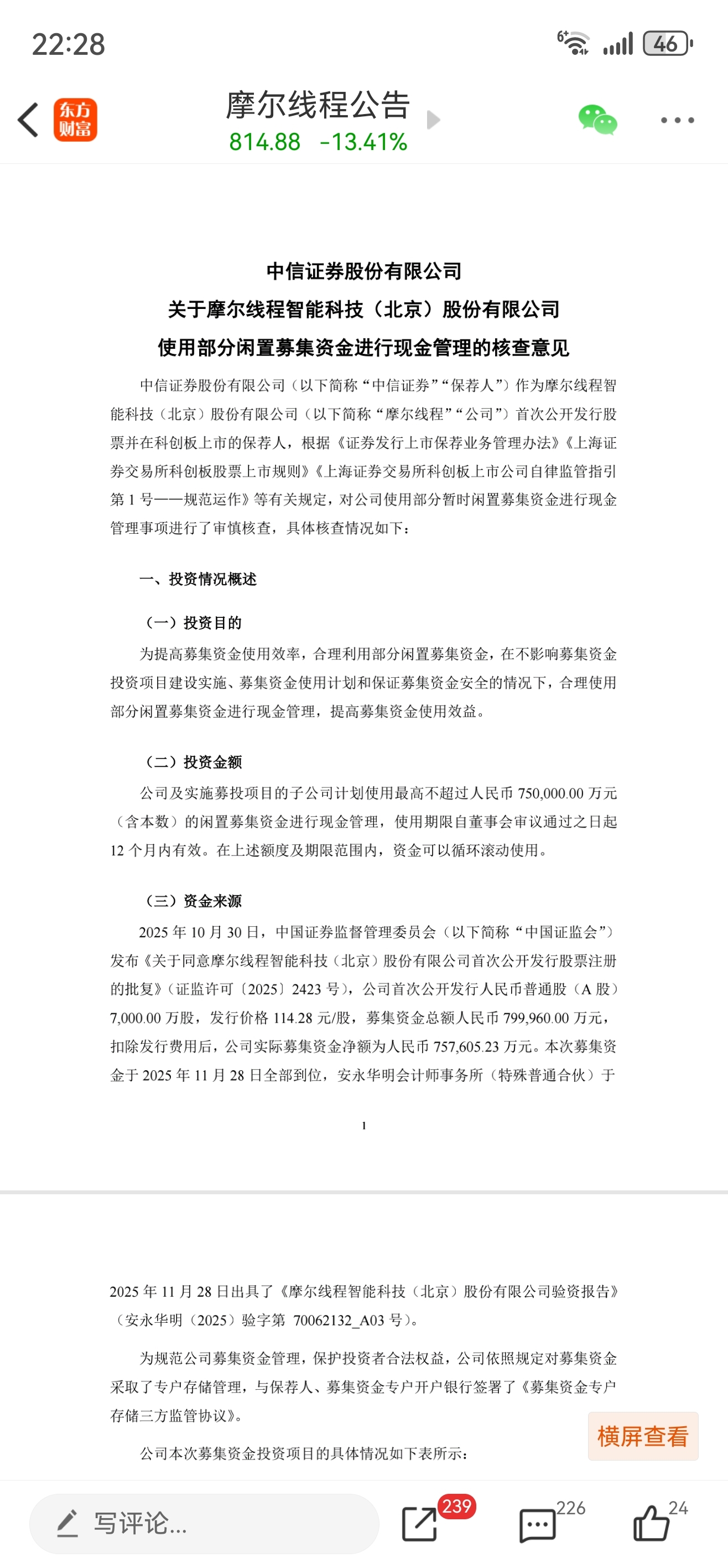 $义翘神州(SZ301047)$ 摩尔线程,中信承保的上市公司,感觉会和义翘神州一个走势,募集资金了不研发拿去理财